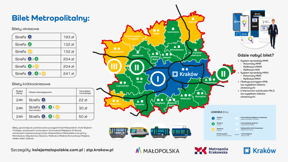 Każdy z ww. biletów uprawnia do nieograniczonej liczby przejazdów, w wyznaczonej Strefie, rozkładowymi pociągami organizowanymi przez Województwo Małopolskie* tj. pociągami obsługiwanymi przez Koleje Małopolskie sp. z o.o., Polregio S.A. i Koleje Śląskie sp. z o.o., a także swobodnego korzystania ze wszystkich połączeń tramwajowych i autobusowych organizowanych przez Miasto Kraków w ramach systemu Komunikacji Miejskiej w Krakowie oraz połączeń autobusowych organizowanych przez Województwo Małopolskie i gminy Wieliczka (system Wielickiej Komunikacji Miejskiej), Michałowice, Niepołomice, Skawina, Wielka Wieś i Zielonki.