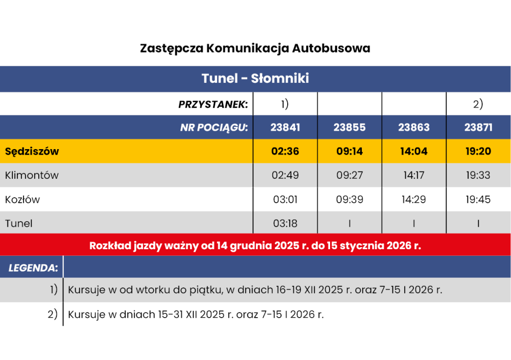 -> w dniach od 14 grudnia 2025 r. do 15 stycznia 2026 r. na trasie SKA2 na odcinku Sędziszów - Tunel